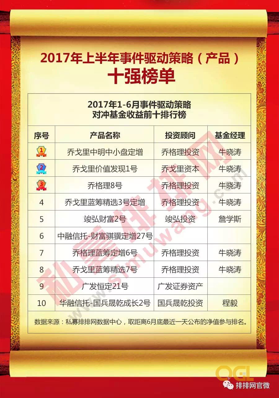 17年7月11日,私募拍拍网发布2017年上半年各大策略基金产品排行榜。在2017年上半年事件驱动策略(产品)十强榜单中,乔戈里资本及乔格理旗下产品十强进六强,并且将冠亚军及季军全部收入囊中,其中乔戈里中明中小盘定增(产品)夺得榜首,乔戈里蓝筹精选3号定增(产品)、乔格理蓝筹定增6号、乔戈里蓝筹精选7号,分别排名第四名,第七名,第八名。